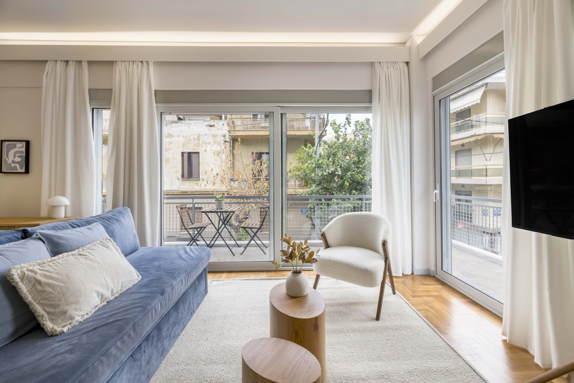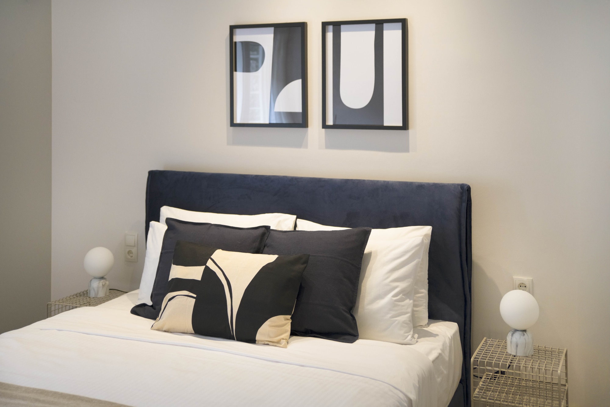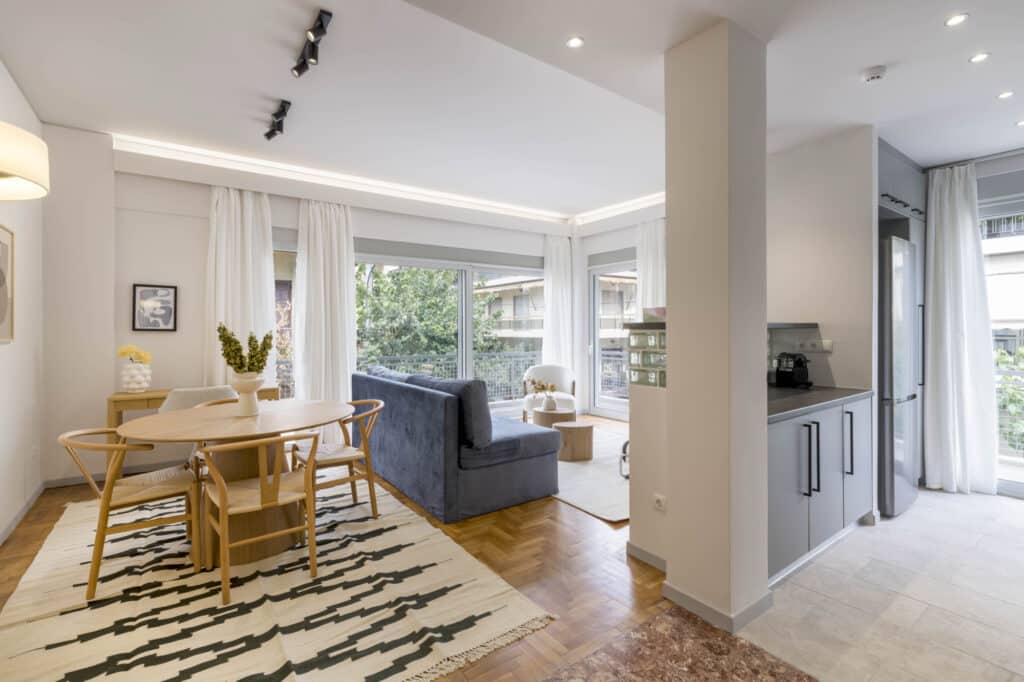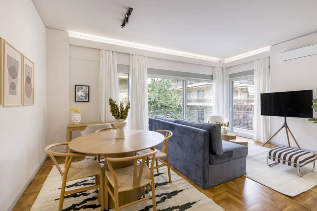 One bedroom with a queen bed (160 cm.). A sofa-bed in the living room. The apartment can accommodate comfortably up to 4 persons. Baby Crib available upon request and with an extra charge.