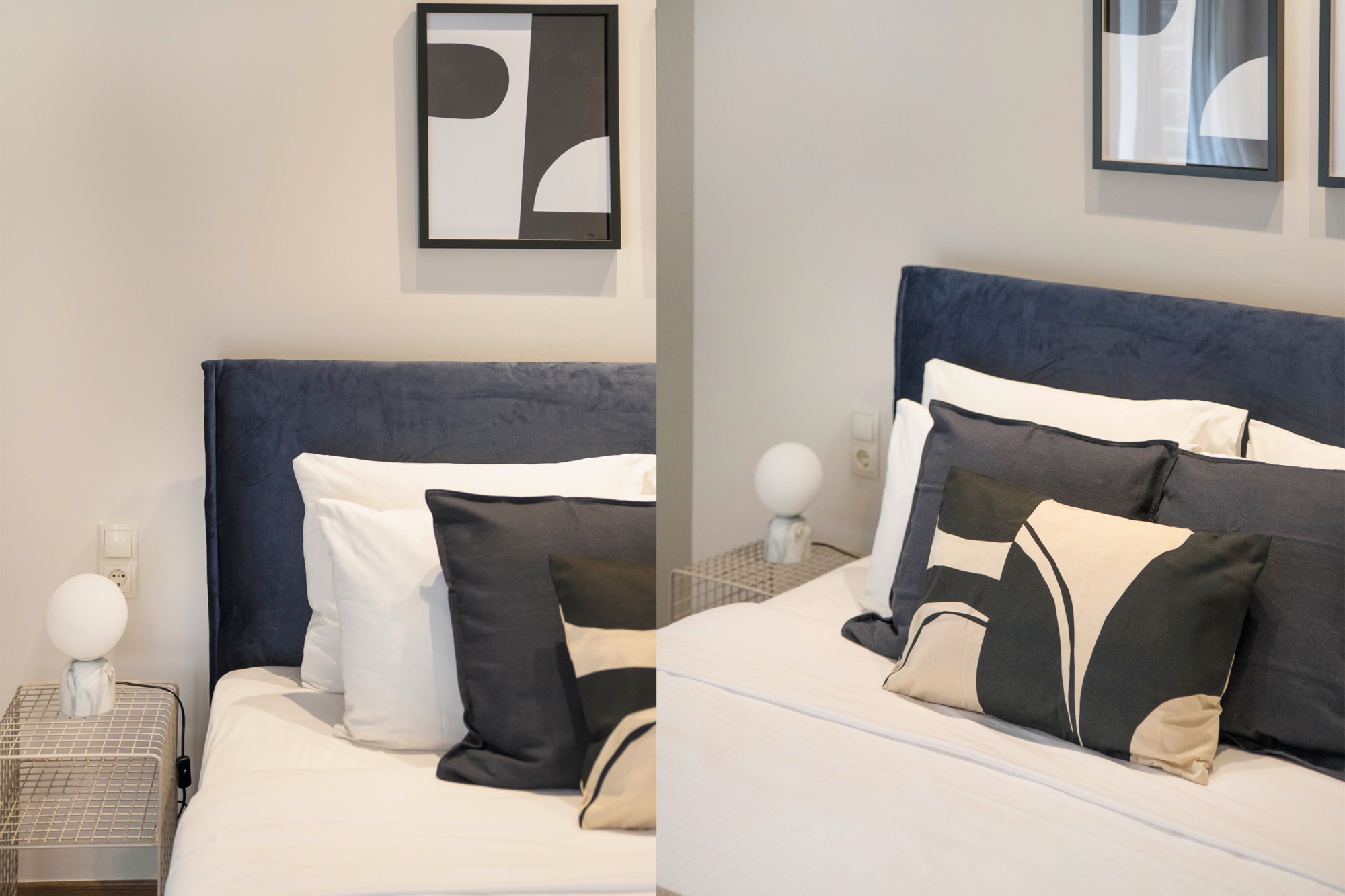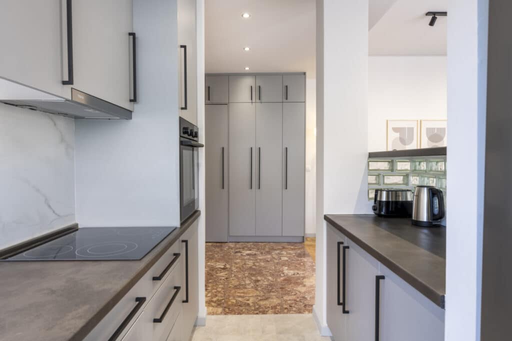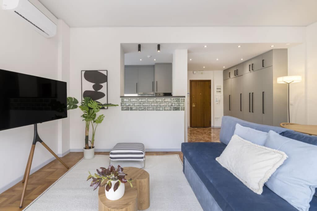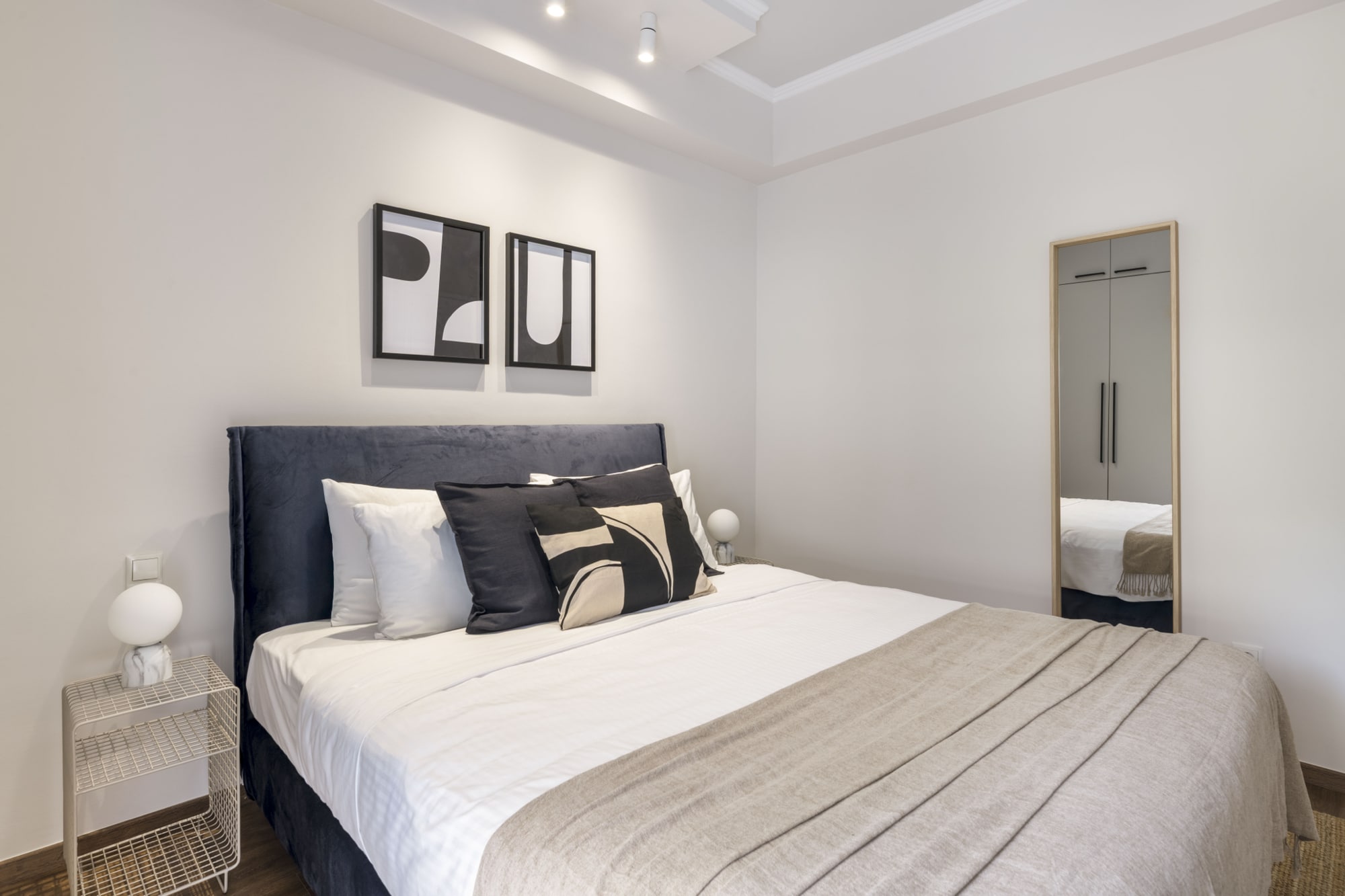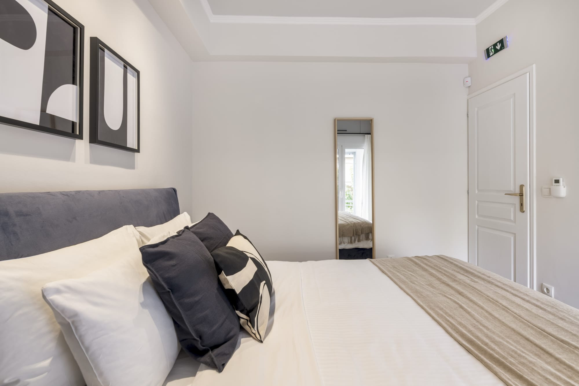 One bedroom with a queen bed (160 cm.). A sofa-bed in the living room. The apartment can accommodate comfortably up to 4 persons. Baby Crib available upon request and with an extra charge.