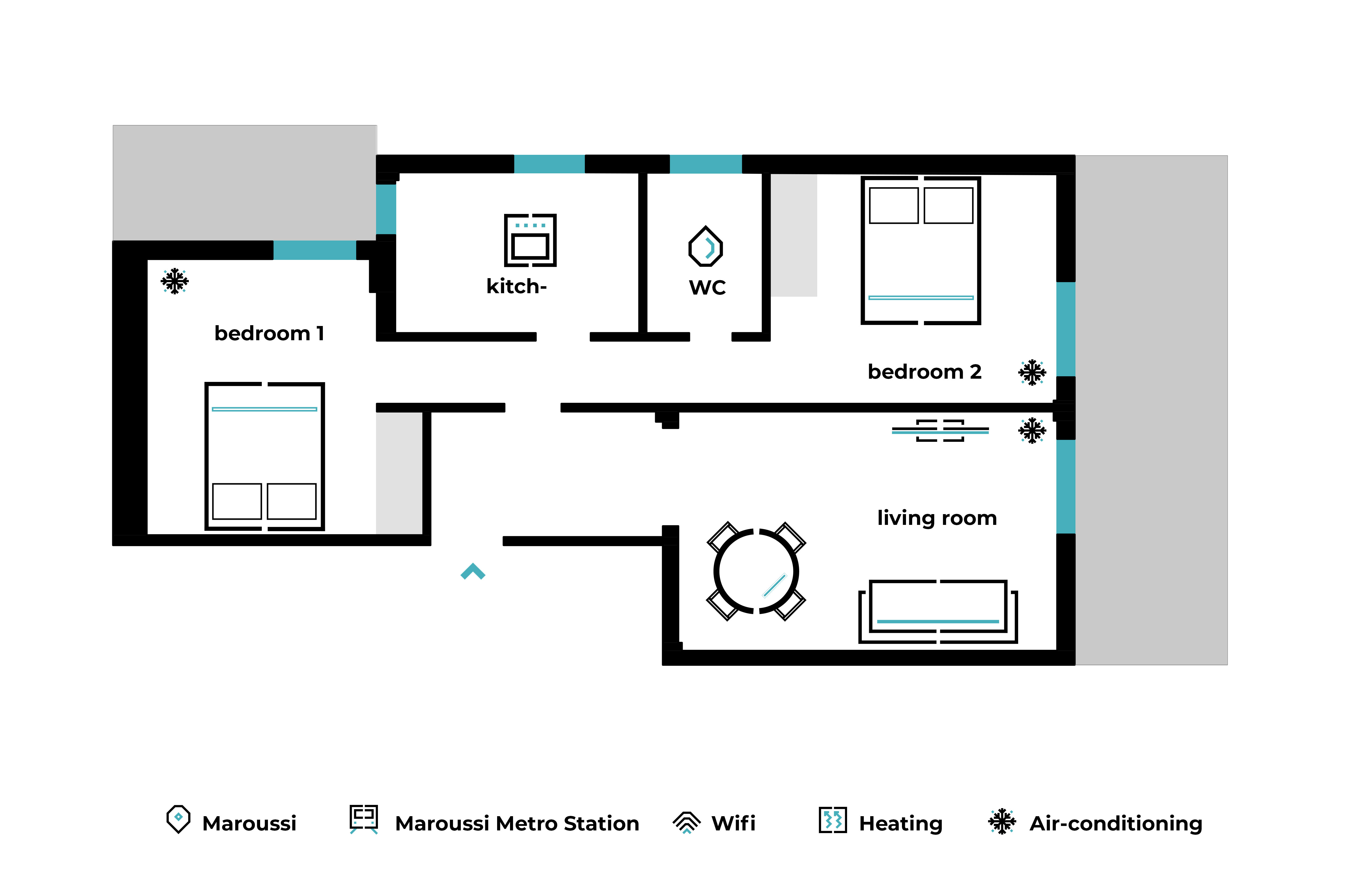 Two bedrooms with a queen bed in each one (160 cm.). The apartment can accommodate comfortably up to 4 persons. Baby Crib available upon request and with an extra charge.