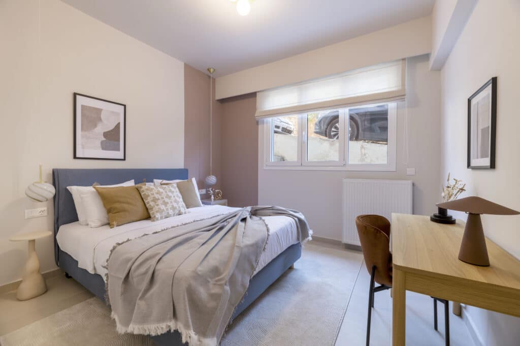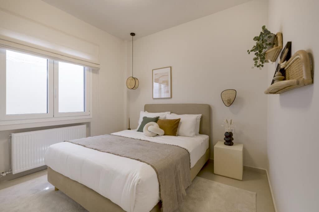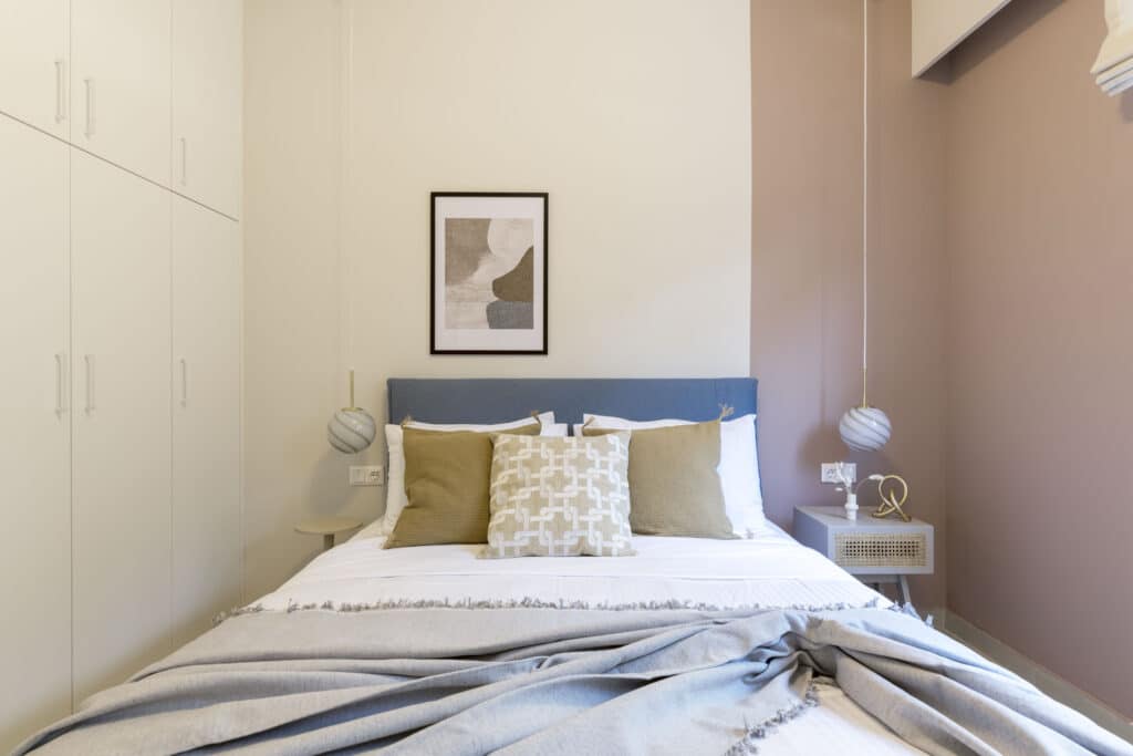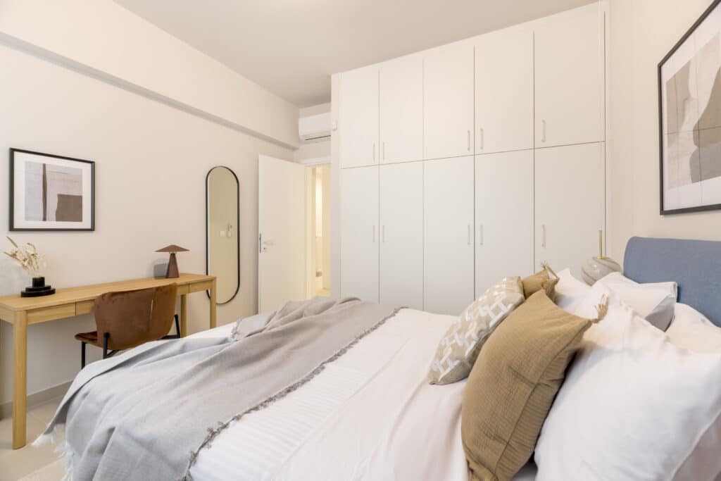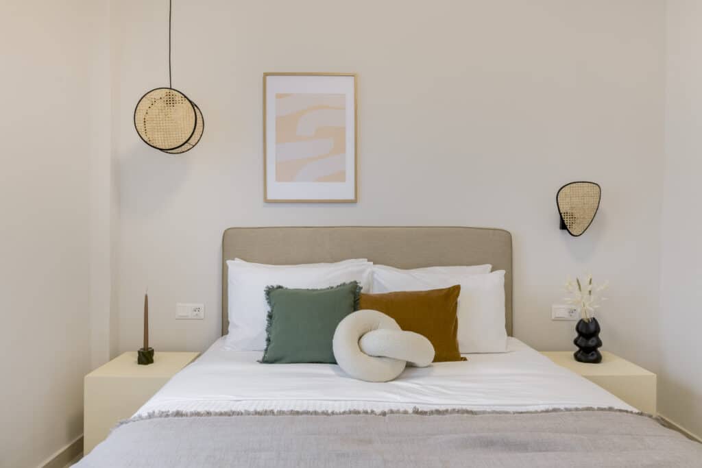 Two bedrooms, each with a queen bed (160 cm).  A sofa-bed in the living room. The apartment can accommodate comfortably up to 6 persons. Baby Crib available upon request and with an extra charge.