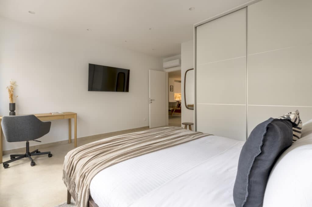 Sleeping Arrangements: Two bedrooms, each featuring a comfortable queen-size bed (160 cm.), and a sofa bed in the living room. The apartment can comfortably accommodate up to 4 guests. A baby crib is available upon request and at an additional charge.